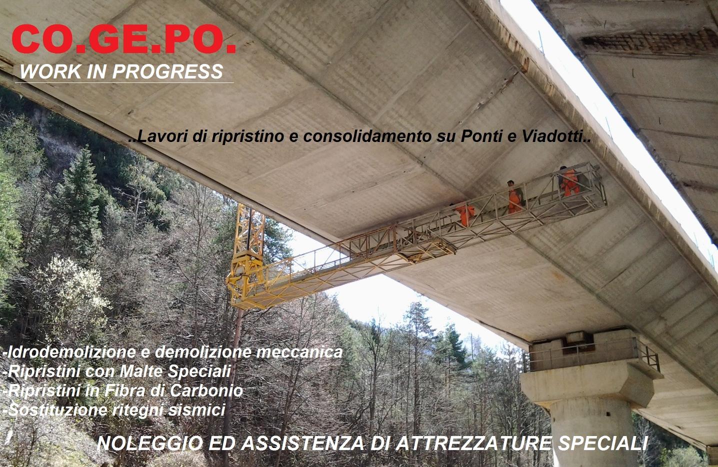 La  CO.GE.PO work in progress si evidenzia nel servizio offerto a tutte quelle imprese  che operano nella salvaguardia ed il restauro di Ponti e Viadotti,dando una collaborazione a 360°, che permette alle imprese che la coinvolgono di  assicurarsi un intervento professionale, con la certezza dei costi ed un risultato qualitativo sorprendente